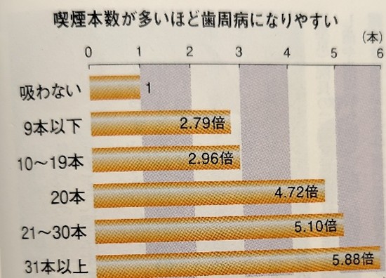 歯周病に対しても、タバコは最大の危険因子。ヤニがついてざらざらになった歯の表面には、歯周病の原因になるプラークがはりつきやすくなります。更に、タバコに含まれている有害物質が血管を収縮させて血液の流れを悪くするため、歯茎や歯に十分な栄養がいきわたらなくなり、歯周病細菌に対する抵抗力も弱くなってしまうのです。いくつかの調査結果から喫煙本数が多ければ多いほど歯周病になりやすく、重症化しやすいこともわかっています。
