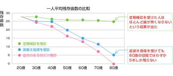 以下のグラフにもあるように、定期健診を受けた人と治療だけを受けた人では、年齢が高くなるにつれて、残っている歯に差が出てきます。