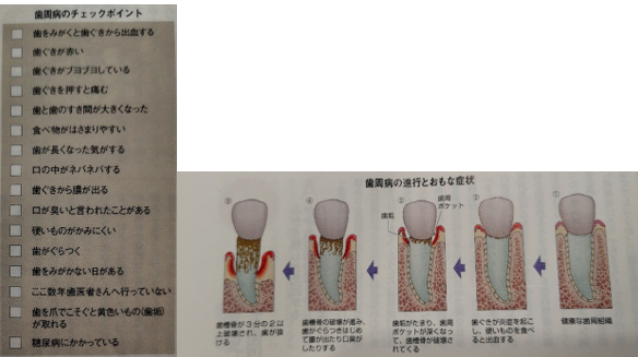 歯の表面にくっついた歯垢は、唾液の中のカルシウムなどと結びついてかたい歯石に変わり、歯茎に炎症を起こします。この状態を「歯肉炎」といい、歯茎は赤くはれ、血が出やすくなります。セルフチェック表を参考に、歯茎の色や状態をよく観察し、歯磨きで出血するようなときには歯科医院を受診してみましょう。